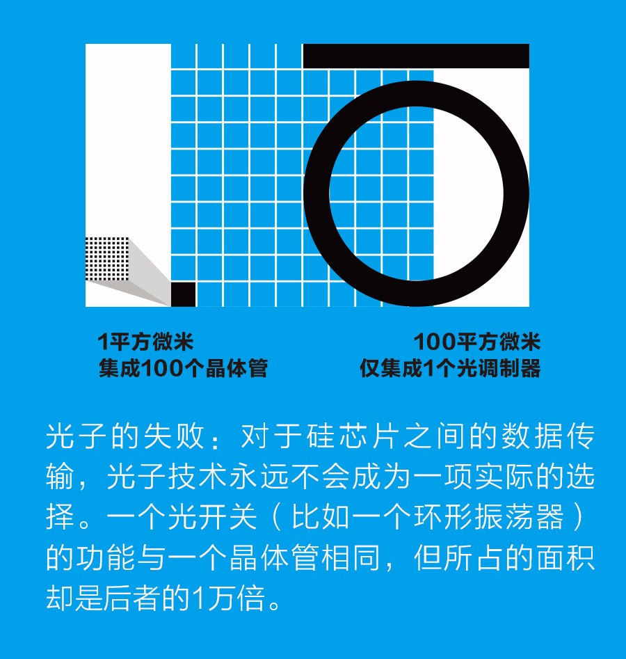 但事實(shí)上,人們完全輕視乃至忽略了一個(gè)事實(shí):電子邏輯芯片的最小特征尺寸縮小的速度,與光子技術(shù)與其保持同步的能力之間,存在越來越大的差距。如今晶體管的特征尺寸僅為幾納米。利用7納米CMOS技術(shù),在芯片上1平方微米的區(qū)域可集成100多個(gè)通用邏輯晶體管,這還不包括晶體管上迷宮般復(fù)雜的銅連接線。在每個(gè)芯片上,除了數(shù)幾十億個(gè)晶體管,還需要十幾層金屬連線將這些晶體管連接起來,形成寄存器、放大器、算術(shù)邏輯單元,以及構(gòu)成處理器核心和其他重要電路的復(fù)雜單元。