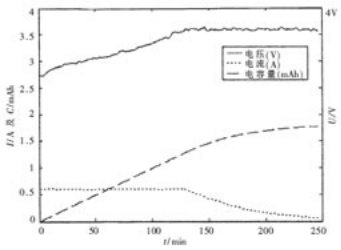这里选用型号为US18650的SONY锂离子电池,其额定容量为1800mAh;经过测量,电池在4.2V左右时的内阻约为0.3Ω。取恒流充电电流为1/3C=0.6A,截止电压为4.2V,充电结束标志电流为0.06A,进行充电试验。图5为充电过程的电压、电流和电容量的曲线。
