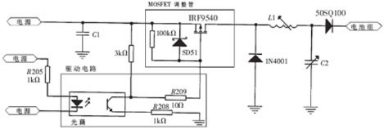 控制器采用脉宽调制(PWM)方式控制供电电流的大小。PWM发生器由另一个20MHz的单片机构成,主控制器和它采用中断的方式进行通讯,控制其增大或减小脉宽。PWM信号通过光电隔离驱动主回路上的MOSFET。开关管、二极管、LC电路构成开关稳压电源。用PWM方式控制的开关电源可以减小功耗,同时便于进行数字化控制,但母线的纹波系数相对较大。PWM控制电路如图3所示。