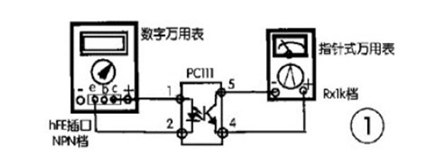 2、数字万用表检测法。下面以英锐恩推出的可兼容亿光817/816的光电耦合器EN817DS(添加链接:http://www.enroo.com)检测为例来说明数字万用表检测的方法,检测电路如图1所示。检测时将光电耦合器内接二极管的+端{1}脚和-端{2}脚分别插入数字万用表的Hfe 的c、e插孔内,此时数字万用表应置于NPN挡;然后将光耦内接光电三极管C极{5}脚接指针式万用表的黑表笔,e极{4}脚接红表笔,并将指针式万用表拨在RX1k挡。这样就能通过指针式万用表指针的偏转角度——实际上是光电流的变化,来判断光电耦合器的情况。指针向右偏转角度越大,说明光电耦合器的光电转换效率越高,即传输比越高,反之越低;若表针不动,则说明光电耦合器已损坏。