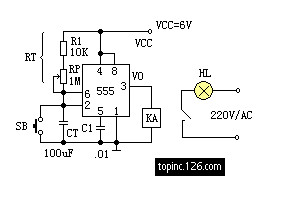 電源接通后,定時(shí)器進(jìn)入穩(wěn)態(tài)。此時(shí)定時(shí)電容CT的電壓為:VCT=VCC=6V。對(duì)555這個(gè)等效觸發(fā)器來講,兩個(gè)輸入都是高電平,即VS=0。繼電器KA不吸合,常開點(diǎn)是打開的,曝光照明燈HL不亮。